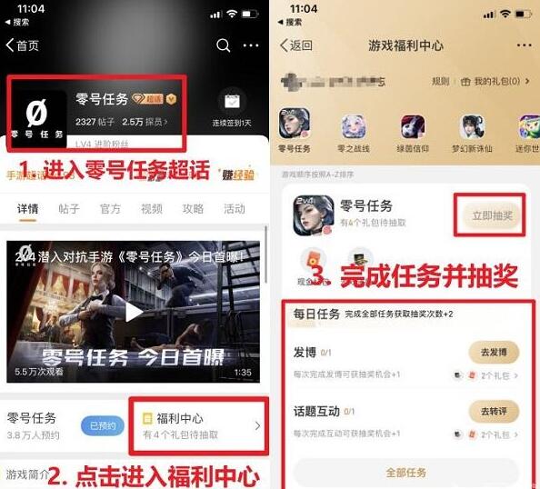 进入#零号任务超话,在福利中心完成任务即可获取抽奖机会,我们抽奖即可获得游戏礼包码。