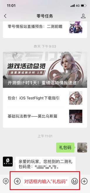 进入零号任务公众号,在屏幕下方对话框中输入“礼包码”即可获得。
