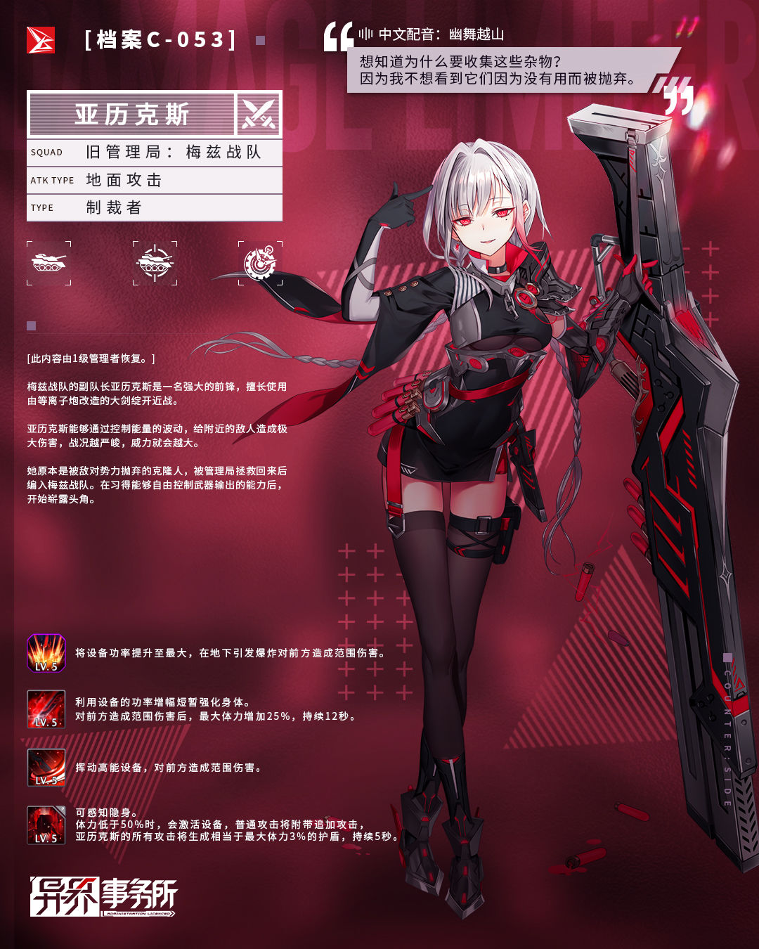 亚历克斯能够控制波动来给附近的敌人造成极大的伤害,情况越危急,威力就会变得越强大。