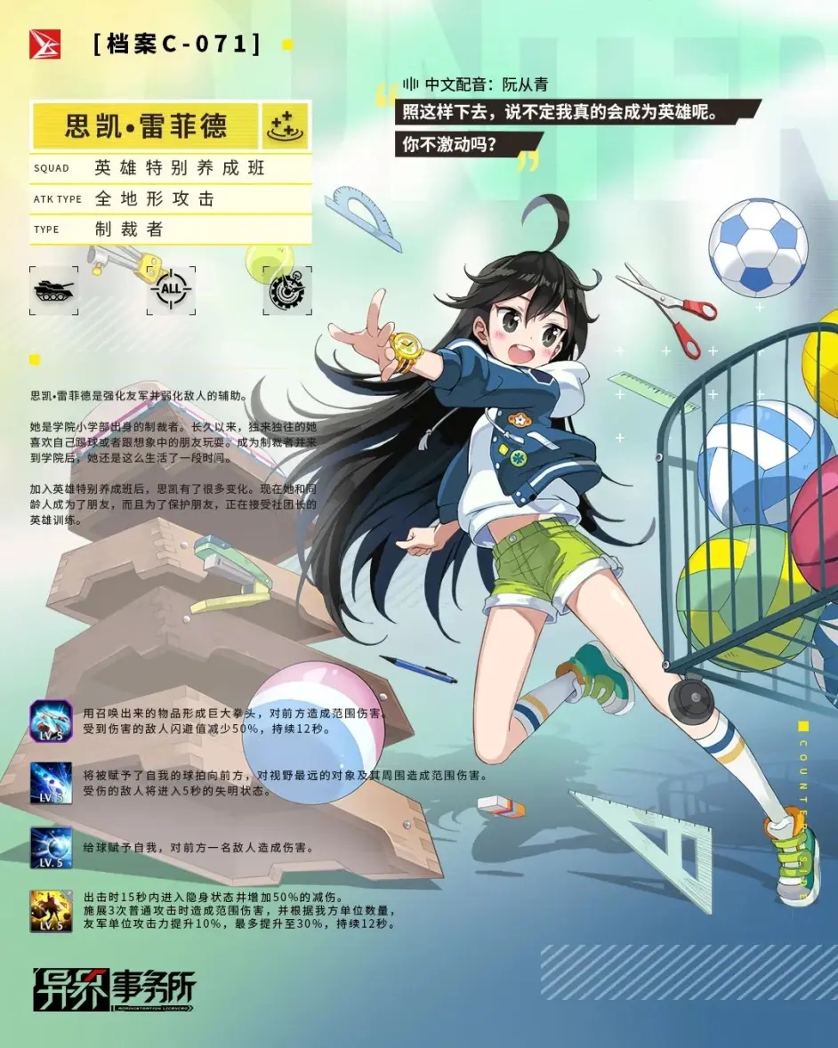 足球妹是3费制裁者辅助,面板一般。普攻远距离范围伤害,被动出场隐身15s,每3次普攻进行一次强化攻击并增加除自己以外友军攻击10%,最多叠加30%持续12s(升满buff额外附加叠加减伤5%最多15%,4费以上免眩晕效果),特殊技对视野范围内最远单位造成范围伤害并失明5s,大招造成大范围伤害并减少闪避能力50%12s(升满眩晕受害单位3s)
