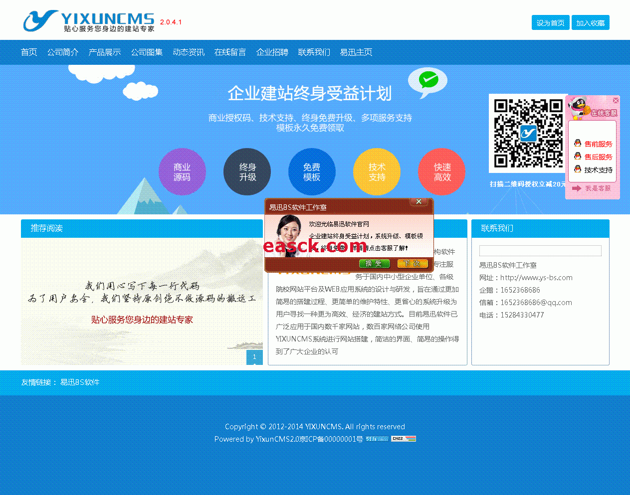 YIXUNCMS网站建设系统 v2.0.4.3 增强版YIXUNCMS网站建设系统是由易迅软件工作室专为中小型企业开发的一套展示类网站系统,采用目前流行的PHP语言并搭配性能稳定的MYSQL数据库。系统特点:1.采用目前流行的PHP语言编写,底层采用超轻量级框架作为系统支撑;2.页面布局使用DIV+CSS技术,遵循WEB标准,及大提高页面的浏览速度;3.使用应用广泛的SMARTY模板引擎,页面高速缓存,提高网站运行速度,降低大访问量对服务器造成的压力;4.采用MVC开发模式,可搭配多套不同风格模板,使网站改版更加轻松;5.PHP5完全的OOP设计思想,支持无限分类;6.前台交互采用AJAX无刷新技术,交互体验更友好;7.操作页面友好提示,随时了解自己的操作动态;8.安装布署及为简单,瞬间搭建好属于您的企业网站;1.运行环境:Apache+PHP+MySql+PhpMyadmin,本机测试建议安装集成环境;2.前端架构:HTML+CSS+DIV+jQuery;3.程序架构:PHP+Mysql;4.默认后台地址:http://您的网址/admin.php注意事项1、共享版软件只适合试用、本地测试及学习交流使用,不得用于商业用途,如需建立商业站点进行外网投放,请使用购买商业版;2、您可以在遵守本协议规定和约束的基础上,对软件进行程序修改、页面美化,以适合您网站的需求。3、您拥有使用本软件构建的网站中收集到的全部会员资料、文章、下载、图片、留言及相关信息的所有权,并独立承担与内容相关的法律义务。4、未经易迅书面许可,您不得对本软件进行二次开发发展任何派生版本、修改版本用于重新分发;5、未商业授权之前,不得将本软件用于商业用途及域名挂靠使用;6、不得对本软件或与之关联的商业授权进行出租、出售、抵押或发放子授权号;7、易迅工作室不保证您所下载系统功能的完整性,如需使用完整的功能请您选择授权版2015.12.03 更新日志:1、新增模板管理功能;2、增设单页、列表页、内容页广告位功能;3、优化前端控制器;4、修复前端部分BUG;