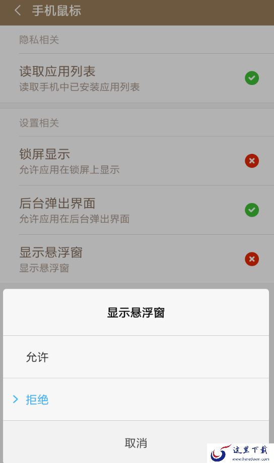 2、接下来在点击“申请悬浮窗权限”右侧的按钮之后,从手机的权限设置类别里,找到显示悬浮窗的功能确认授权。