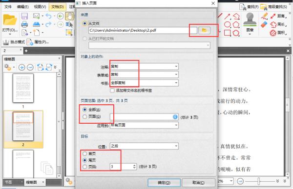 之后会在桌面上弹出【插入页面】的对话框,我们需要在【来源】中点击一下【从文件】的后的文件夹,选择要合并的PDF文件。【对象上的动作】全部选为复制,页面范围和目标需要选择一下。设置完毕后,点击【确定】就可以了。