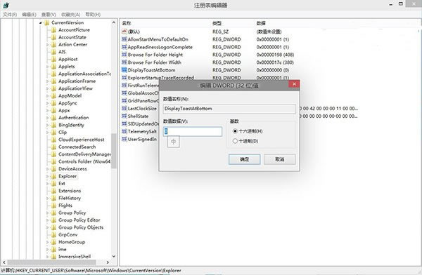 在该注册表项,右侧界面中,找到名为“DisplayToastAtBottom”的DWORD(32位)值,如果没有的话,可以手动创建一个。然后将其键值改为“1”。