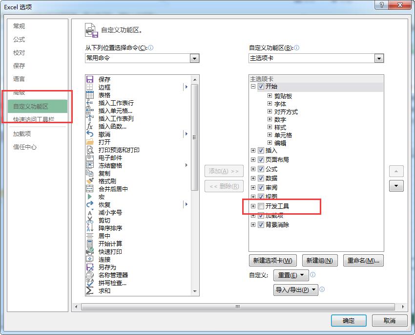 4、选择【自定义功能区】,勾选【开发工具】选项卡。