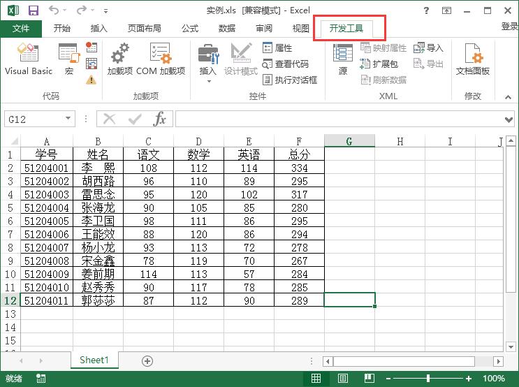 1、用Microsoft Office Excel打开表“实例.xls”。查找工具栏中的【开发工具】选项卡,如果未能找到该选项卡,可以看下面的操作。