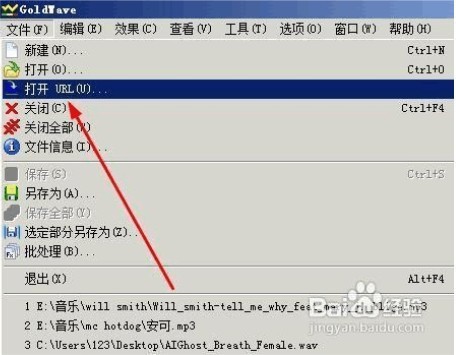 步骤一:先将音乐导入到软件中,打开goldwave以后,在菜单栏上执行:文件--打开,弹出一个打开对话框