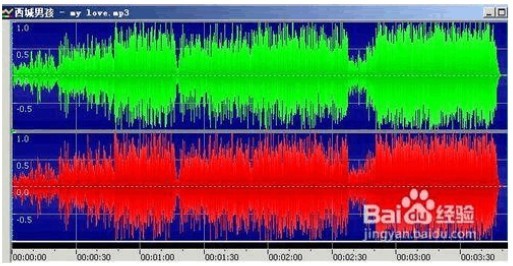 步骤三:这是你看到的导入的音乐转换成声波以后的样子,红色和绿色表示有两个声道,这是立体声,如果只有红色或者只有绿色的声波,这说明你的这个音乐文件不能够消除人声,只有立体声才可以奥。