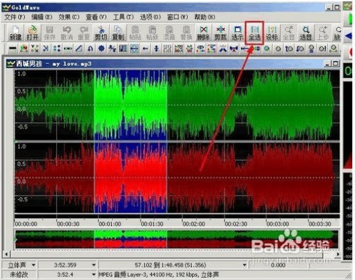 步骤四:如果你只想要消除部分音乐中的人声,你可以拖动鼠标选中该部分声波,如果你想要将全部的音乐中的人声去掉,你可以点击工具栏上面的【全选】