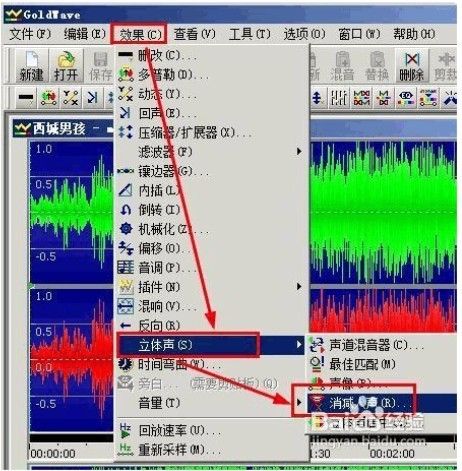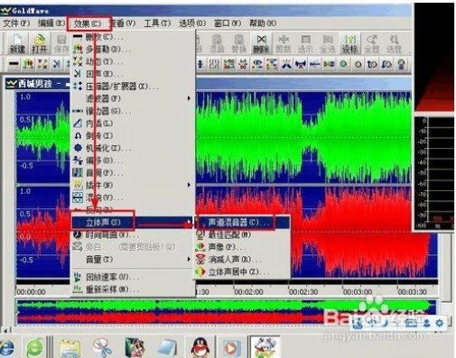步骤五:选取要修改的声波以后,我们就要消除人声了,这里有两种消除人声的方法,一种是利用声道混合、另一种是消减人声,我们分别来介绍两种方法,先使用声道混合,在菜单栏上执行:效果--立体声--声道混合器