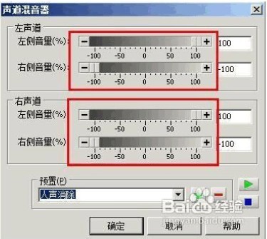 步骤六:打开声道混合器以后,我们在调节左声道的左侧音量为百分之百,右侧音量为百分之付一百,同样的道理调节右声道,这样做的原理是:不管是左声道还是右声道都有共同的声音,通过让左右声道都减去共同的部分只剩下不同的部分,而不同的部分里没有人声,所以就消除了人声。点击确定按钮。