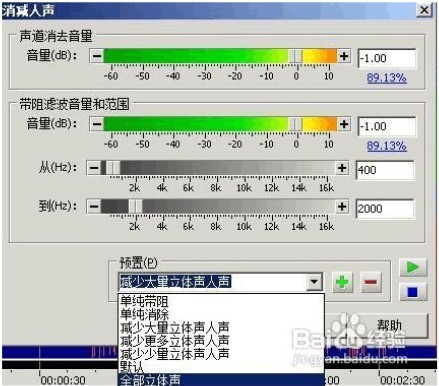 步骤二:打开消减人声以后,你会看到这个对话框,下面有一个预置列表,从列表里你可以选择不同的模式,比如单纯带阻就是使用带阻滤波消除人声,而单纯消除就是使用上面提到的原理,利用左右声道消除人声,两种模式有不同的音乐效果,一般都不使用这两个,一般使用的是下面的三种减少立体声人声,而具体使用哪一种模式就要靠你的耳朵来听了,看看哪种效果更好一些。