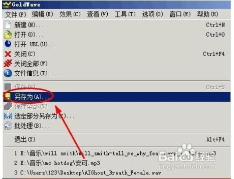 完成最重要的部分以后,你可以保存音乐了,如果你的音乐的原声带还有用,你不要点击这里的保存,这回使原来的音乐被修改成没有人声的。你可以看下面第二幅图,在菜单栏上执行:文件--另存为。好了将因为保存就可以使用了。
