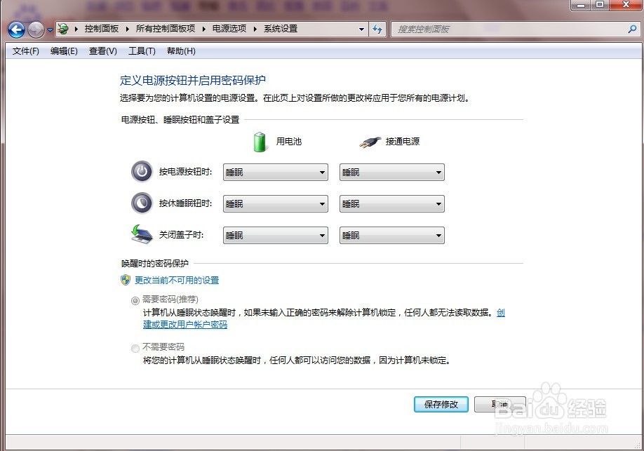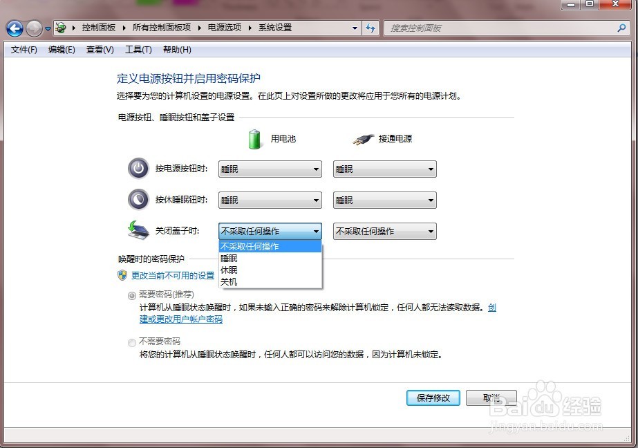 根据您的需求配置关闭盖子时的动作,如果用电池和接通电源的时候都不需要做什么动作,直接按照下图配置就好