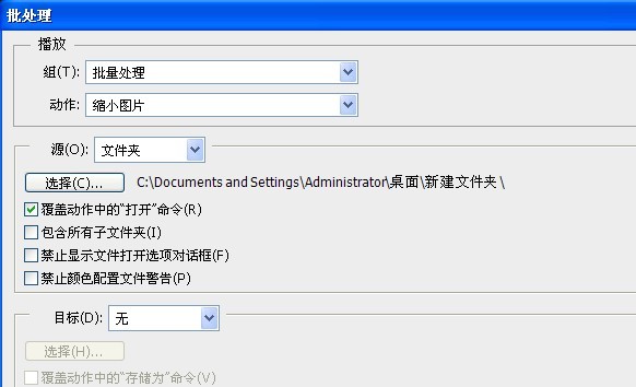 批处理面板→在组合上选择“批量处理”→动作选择“缩小图片”