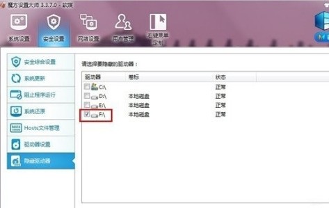 2、如下图所示,在魔方设置大师中,选择:安全设置-->隐藏驱动器。