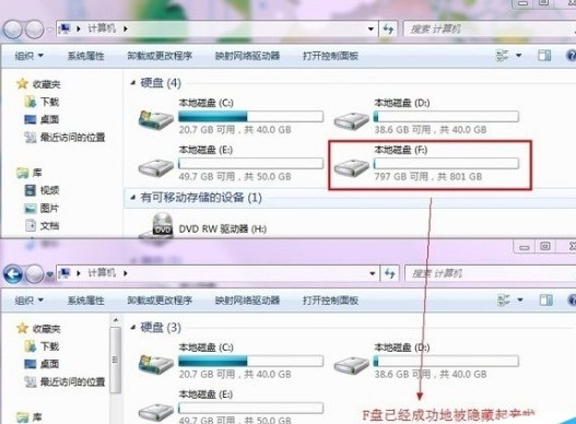 4、此时再打开我的电脑,对比之前的截图,看看是不是硬盘分区已经成功地被隐藏掉了,原来存在的F盘已经不见了!