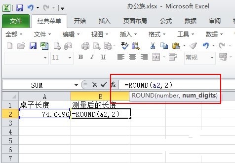 2.在选定计算结果的单元格内输入“=ROUND(a2,2)”,按Enter键确定。