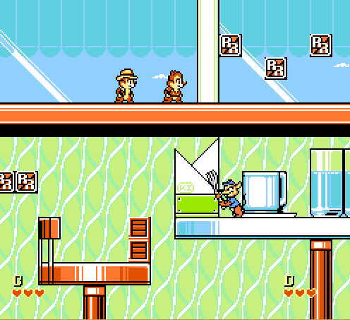但如果要说最有趣的,恐怕还是要说到该作的系统设定上。在原版动画中,主人公有奇奇(Chip)和Dale(蒂蒂)两位角色,所以在依据动画改编的游戏中,同样也是如此设定的。同时这也意味着《松鼠大作战》是一款可以在红白机上支持双人模式玩法的游戏作品。