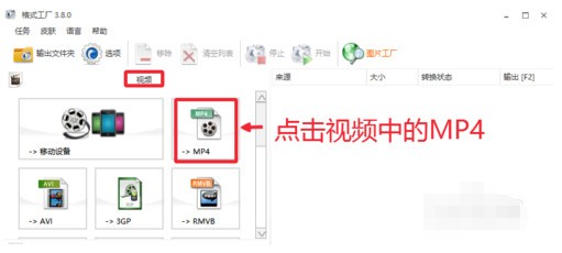 1.首先下载安装格式工厂到自己电脑,然后打开运行格式工厂软件,窗口界面中,我们点击视频中的MP4选项打开
