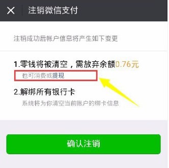 8、当提现完成后,重复步骤1-3,进行到【注销微信支付】界面,如下图;如果银行卡里保存了多张银行卡,需要先解除,点击【解绑所有银行卡】,进行删除完成后,返回到【注销微信支付】页面,点击【确认注销】