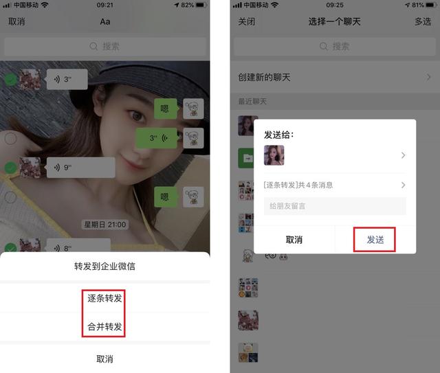 随后会出现转发选项,可以选择【逐条转发】或【合并转发】,我们先试试【逐条转发】,选择一位聊天好友,点击【发送】即可。