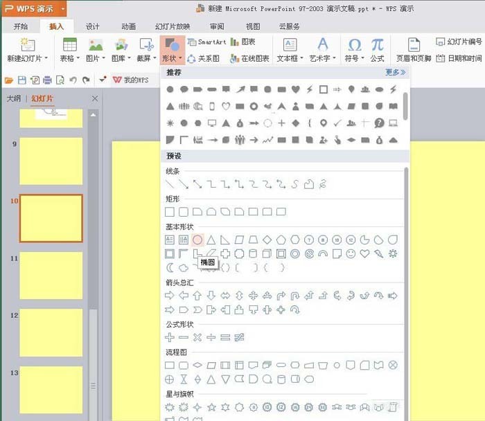 1、打开PPT文件,点击“插入”--“形状”--“椭圆”,或者插入自己需要的形状。