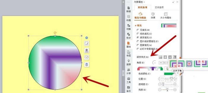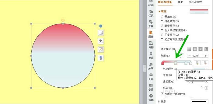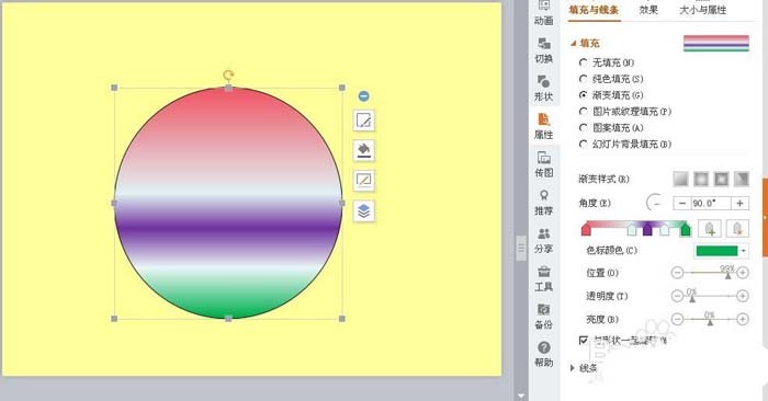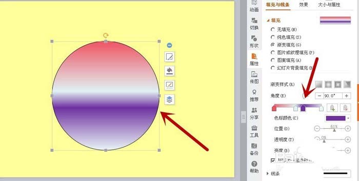 3、在右侧的快捷栏内点击“渐变色填充”。我们的圆形内出现了默认的渐变色。