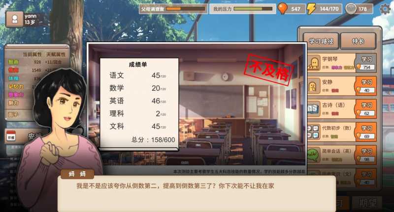 《中国式家长》就将"如果让你重新过一遍自己的人生,你会将生活中的遗憾逐个弥补吗?"这个命题以"人生模拟器"的形式展现了出来,作为一款典型的角色养成游戏,其覆盖了从出生到进入社会的人生经历,玩家可以安排自己每天的日程,从而影响"人生"的走向。并且游戏的题材非常讨喜,很好地把握住了"中国式"的精髓,将大多数中国学生的那些往事一一进行了还原。