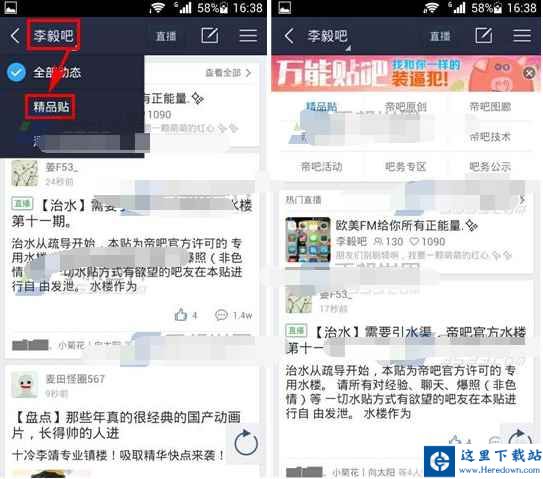 2)点击左上角的【吧名】,然后选择【精品贴】就可以查看到该吧的精品贴了。(如下图)