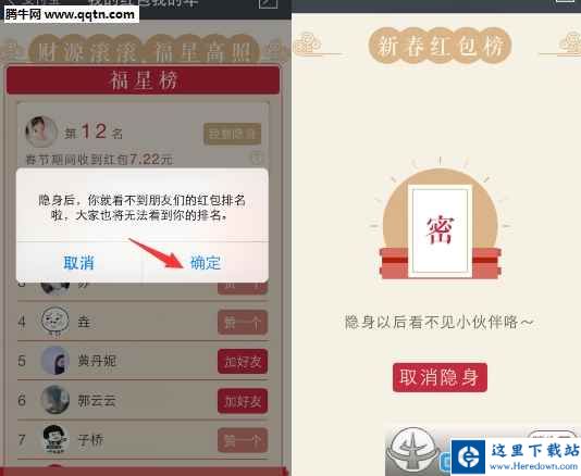 2、开启隐身后,系统会自动提示你看不到朋友们的红包排名,大家也无法看到你的排名,确定后,就成功隐身啦!