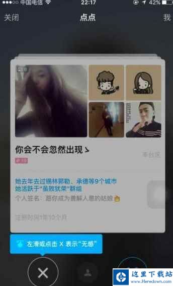 2、在这里你会看到各种陌陌的名片,左滑或者点击叉号表示无感!