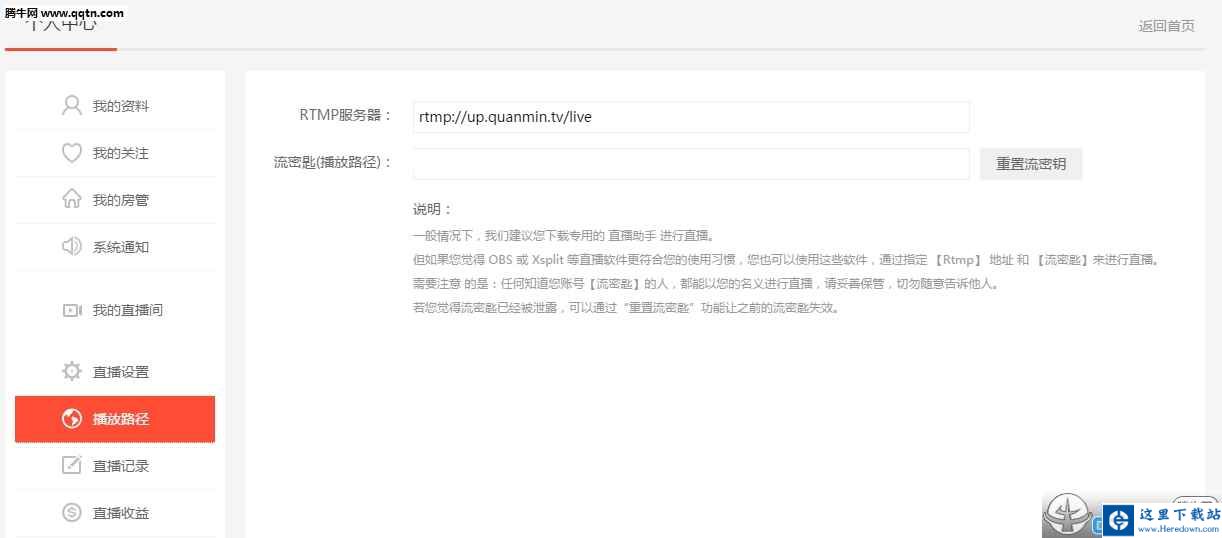 点击【个人中心】,在【播放路径】中找到【流密匙】填入OBS中