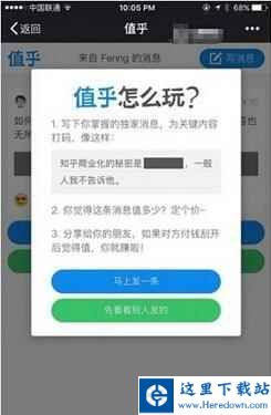 而如果你点击进“值乎”的消息,会出现一条勾起你好奇心的“打码”信息——到了这一步,几乎无法压抑自己的好奇心,“到底这条价值 x 元的消息是什么?”