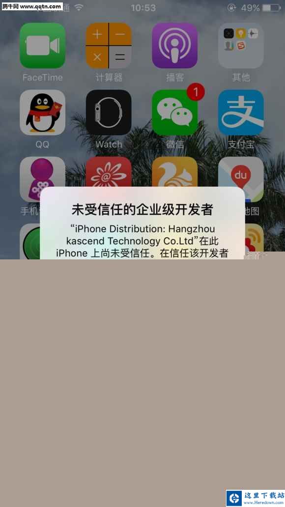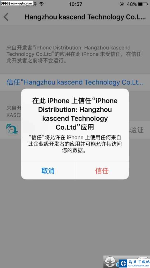 3、返回系统主页,依次点击:设置-通用-设备管理 找到【Hangzhou kascend Technology】,点击进去,有个【信任“Hangzhou kascend Technology”】选项,点击【信任选项】