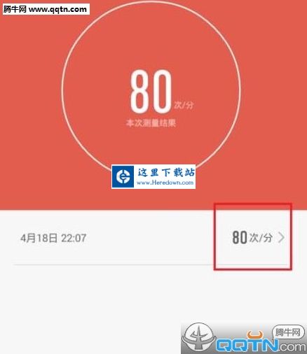 5、大约经过几十秒之后,在页面中就会出现我们心率的测量结果,我们可以看到自己心率的最终数值。点击如下图所示的位置即可进入下一个页面。