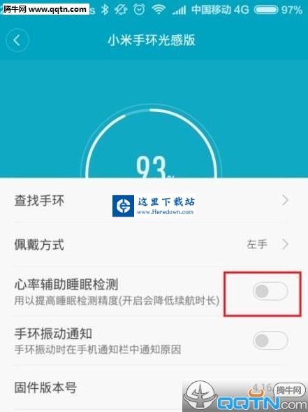 10、接下来,我们点击开启小米手环光感版的心率辅助睡眠测试开关,就可以更加精准的测量我们的睡眠时间,但是会增加电量的消耗,小伙伴们赶快试试吧。