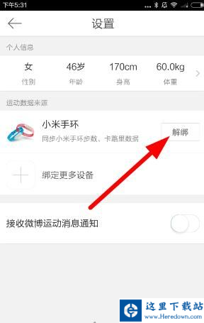 2、在设置界面,点击小米手环解绑按钮,解绑运动设备后就不用再记录你的运动数据的哟·