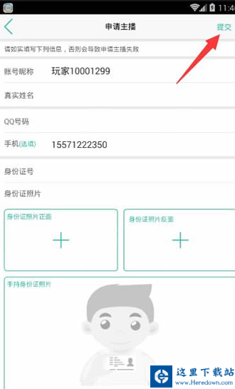 4、在申请主播页面中你需要填写自己的真实姓名和QQ号码、手机号码等联系方式,还需要填写自己的身份证号并上传身份证正、反面照片以及本人手持身份证照片,切记身份证照片中文字和头像要清晰可见,以免导致审核不通过申请失败!全部填写完毕后点击右上角的“提交”按钮就可以了,工作人员会尽快对你的申请进行审核,审核通过之后就可以进行直播了!