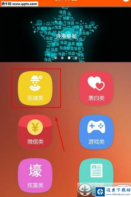 1、打开装B神器,点击恶搞类;