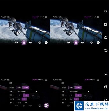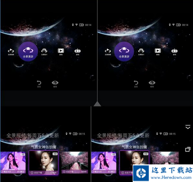 进入魔镜后,手机端画面一分为二。主界面为星空背景,选项分为5个,全景漫游对应现场中的自带音效图片。在魔镜中看到的在线资源与市场中一致,同样可以直接下载。点击影视后直接进入在线视频列表,大部分资源为精选片段,涉及到版权原因尚未支持整片下载,片源的更新状况还可以,近期一些新片的预告也有放出;影视内有本地的子选项,用户可以自行添加视频内容观看,本地视频可以转换3D,播放选项也比较丰富,可以说这是暴风魔镜的杀手锏之一。(相信大家一定也看到了偷窥的选项,别乱想,那只是开启摄像头而已,效果一般)。