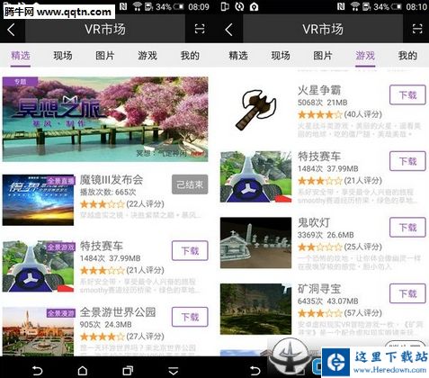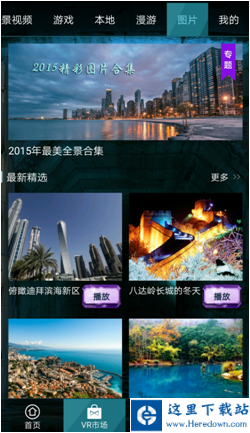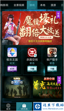 进入APP主界面后是暴风自营的VR市场,主要包括四类:精选、现场、图片以及游戏。精选为合辑,大部分为推荐内容;现场为全景视频或者带音效的全景图片,全景视频每周五进行更新;游戏分为头控式和手柄式操作,3D游戏居多,不过质量一般。VR市场的所有内容都可以直接下载并在VR中查看。不过,一些暴风认为质量较高的资源设置了购买权限,用户需充值魔豆才可下载,100魔豆10元人民币。