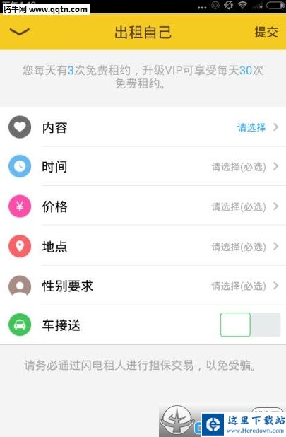 点击【我要出租】按钮之后,进入到出租信息界面中,输入相应的信息,包括出租内容,比如吃饭,喝咖啡,看电影,唱歌,打游戏,健身等等,然后出租的时间,价格,地点,性别,还有是否车接送等等,选择完毕之后,点击提交!