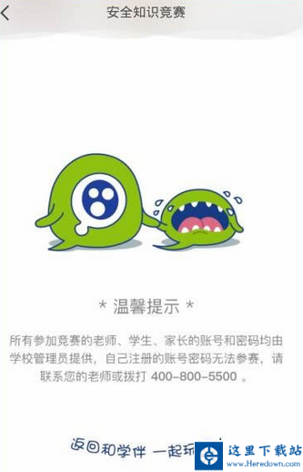 2、在安全知识竞赛页面即可开始答题,但在这里需要注意的是所有参加竞赛的老师、学生、家长的账号和密码均由学校管理员提供,自己注册的无法参赛,请联系你的老师或拨打400-800-5500获得参赛资料。