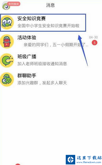 1、打开课后帮APP,在消息页面点击安全知识竞赛;