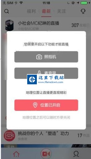 2、点击中间的摄像按钮,开启相机,麦克风,位置之后,点击我要直播按钮就可以手机直播