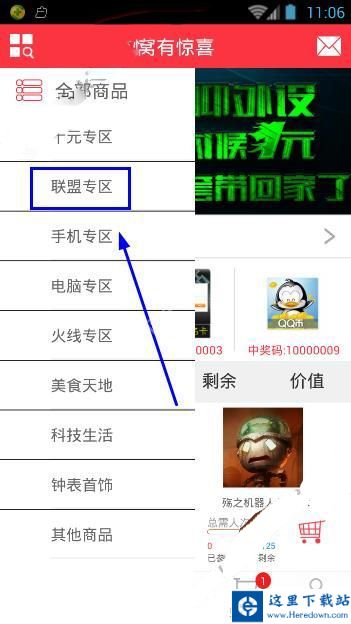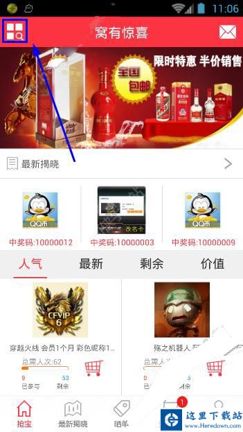 1、首先你需要点击本页面中的窝有惊喜app进行下载安装,然后就可以注册进入,在【抢宝】界面,打开如下图箭头指示的左上角的图标。