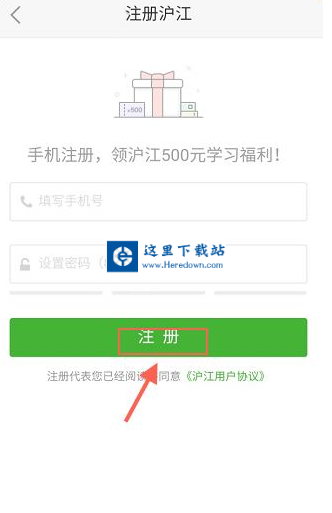 2、在注册页面,填写手机号及密码后,点击注册按钮;
