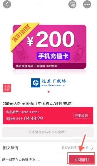3、接着,选择想要夺宝的商品点击进入,接着在夺宝详情页面,点击【立即前往】按钮进入;