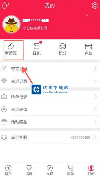 1、打开app,注册登录后,在【我的】页面,选择文字【幸运豆】进入;